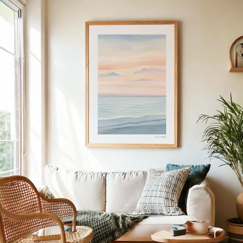 ピンクと青のグラデーションが綺麗な水平線のアートポスターです。